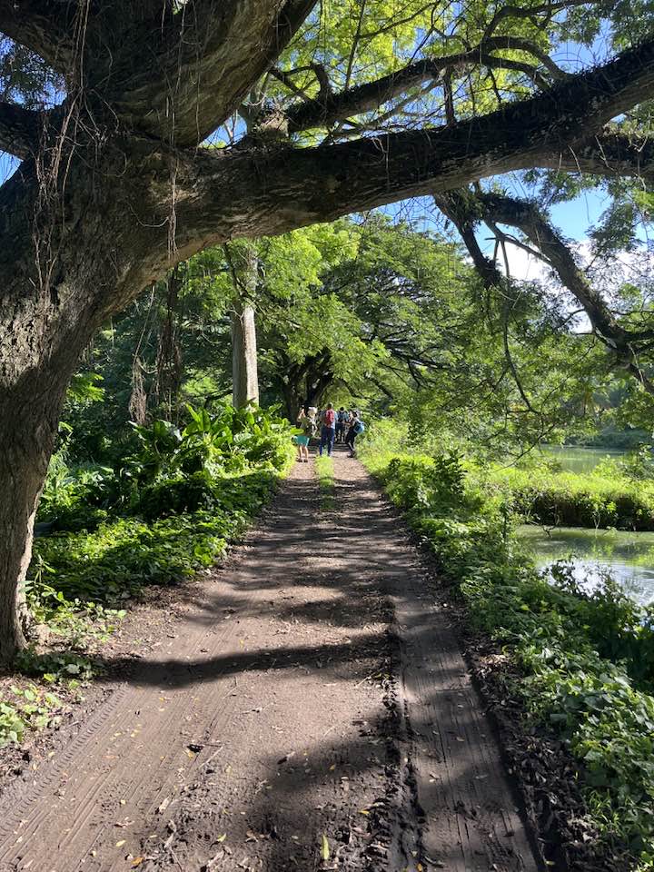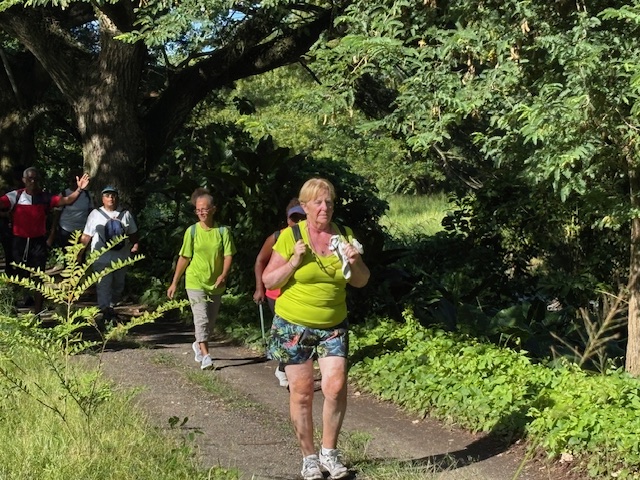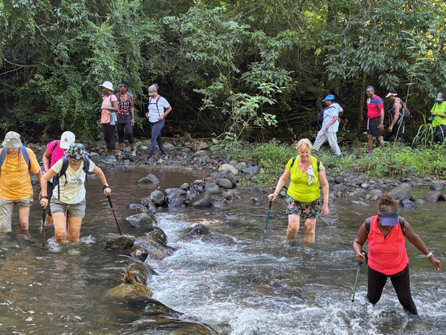 Après une première halte autour de la roche gravée et les commentaires éclairées de Marie-Line, ce fut le passage dans l’allée des Zamanas, tels des gardiens de l’histoire, à la fois majestueux par leur beauté naturelle mais ô combien chargés du poids d’un passé lourd de douleurs. La proximité des bassins d’aquaculture d’André Mangatal alimentés par une des branches du Canal de Beauregard insufflait une certaine fraicheur apaisante et un total dépaysement.  L’instant d’une piqûre de rappel sur l’origine de ce patrimoine exceptionnel c’est déjà la traversée à pied de la rivière du Carbet pour rejoindre le parking de l’ex-Aqualand totalement envahi par une végétation dense et luxuriante. Un spectacle de désolation qui interpelle quant à notre capacité collective à mener à bien des projets originaux et structurants.