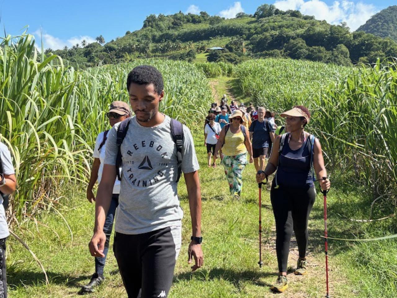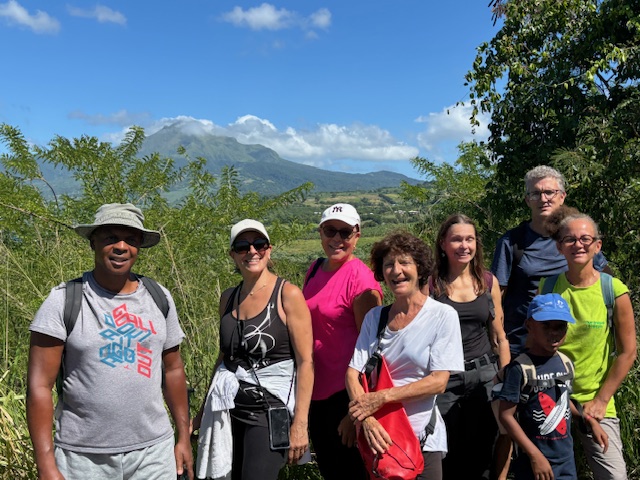 Juchés face au Petit Piton, nos randonneurs prirent le temps d’apprécier ces massifs volcaniques d’exception source d’inspiration où une lecture de paysage s’imposait. La chaine des Pitons à l’Est, Dame Pelée au Nord, telles des boussoles, nos monuments naturels emblématiques resplendissaient de beauté. Tout était harmonie. Les planètes semblaient s’aligner tandis que le soleil continuait de taper à mesure de notre ascension. Enchantés par ce moment champêtre, ils découvrirent peu à peu les sonorités urbaines, d’abord les premières résidences du quartier Fromager avant de dévaler les pentes qui menèrent jusqu’à la place de l’Église, le temps d’une rencontre informelle avec Ziouka un des meilleurs glaciers du pays.  Puis vint le retour vers Le Coin où chaque pas résonnait comme une nouvelle promesse de découvertes.