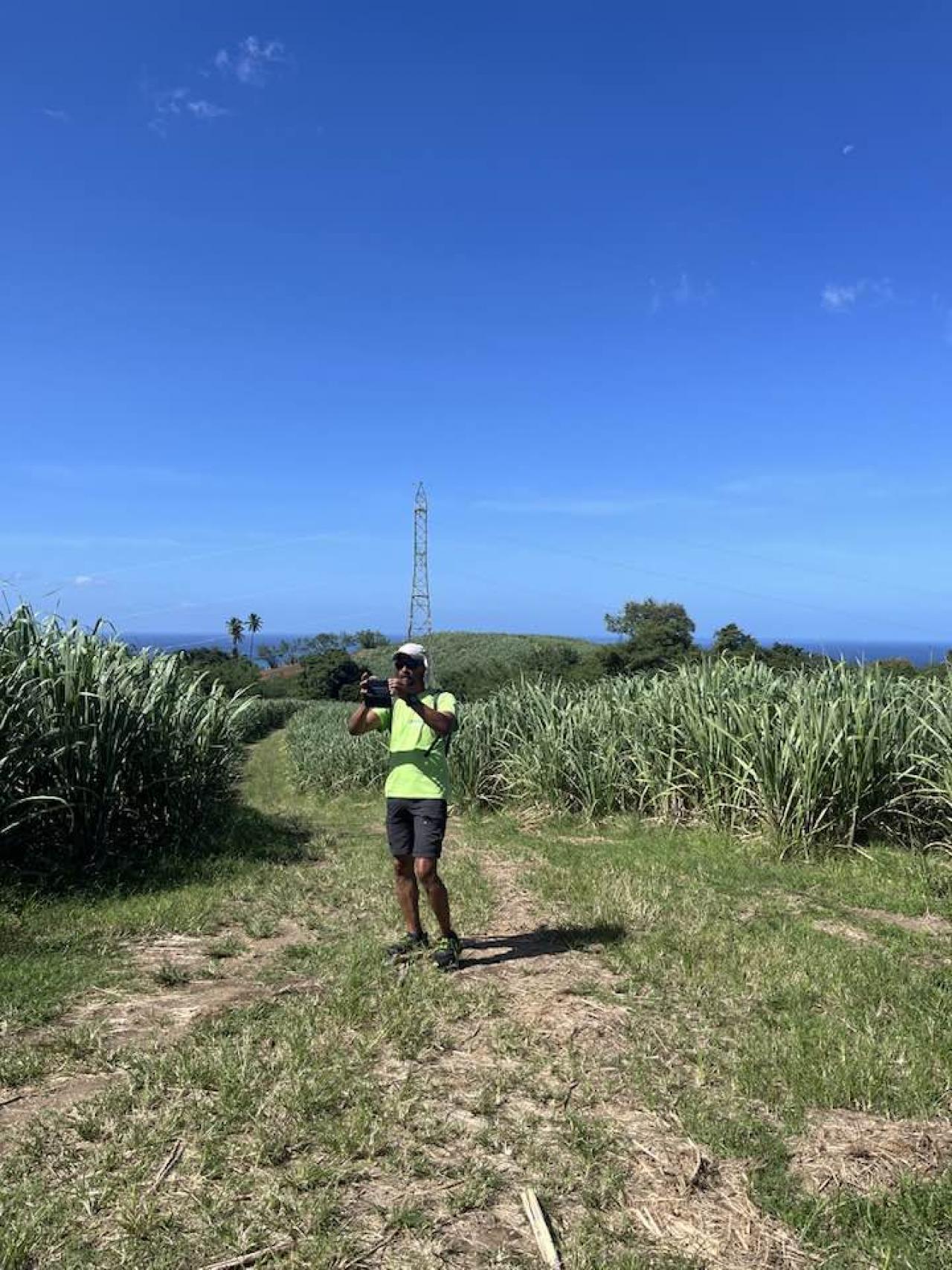Si le parcours choisi avec soin n’était jusqu’alors qu’une promenade de santé, la seconde partie de la rando fut d’un tout autre acabit. La montée des Hubervic en hors d’œuvre avec en plat de résistance une percée au beau mitan d’un morne revêtu d’un épais tapis forestier qui nécessita la sortie des coutelas. Fort heureusement, ce quart d’heure d’effort soutenu fut récompensé tout en haut du morne par une vue panoramique d’une beauté saisissante où seule manquait la caméra de Yann Arthus Bertrand que notre guide a connu lors d’un tournage aux Antilles d’un « Entre Ciel et Terre ».