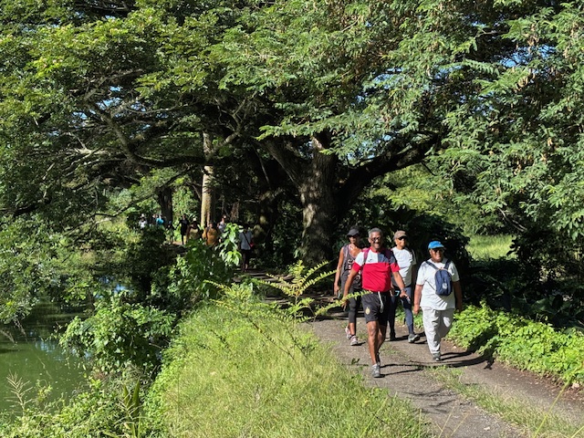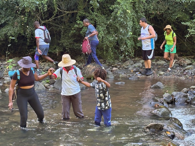 Après une première halte autour de la roche gravée et les commentaires éclairées de Marie-Line, ce fut le passage dans l’allée des Zamanas, tels des gardiens de l’histoire, à la fois majestueux par leur beauté naturelle mais ô combien chargés du poids d’un passé lourd de douleurs. La proximité des bassins d’aquaculture d’André Mangatal alimentés par une des branches du Canal de Beauregard insufflait une certaine fraicheur apaisante et un total dépaysement.  L’instant d’une piqûre de rappel sur l’origine de ce patrimoine exceptionnel c’est déjà la traversée à pied de la rivière du Carbet pour rejoindre le parking de l’ex-Aqualand totalement envahi par une végétation dense et luxuriante. Un spectacle de désolation qui interpelle quant à notre capacité collective à mener à bien des projets originaux et structurants.