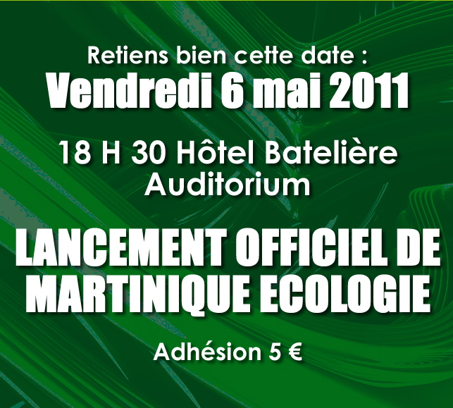 Un vrai sursaut politique Nous sommes un certain nombre d’écologistes à réfléchir depuis plusieurs années sur l’idée de créer un parti authentiquement écologiste à la Martinique. Certains d’entre vous l’espéraient, d’autres le réclamaient… nous l’avons fait en créant Martinique Ecologie. L’urgence de la situation environnementale du pays nous l’impose. Bien sûr, il ne s’agit pas de créer un énième parti voire même de tenter de politiser l’écologie. Notre objectif est aussi de fédérer l’ensemble de la mouvance écologiste du pays afin d’écologiser la politique. Ni fonds de commerce, ni prétexte électoraliste, l’écologie se doit d’être au cœur du débat politique et nous devons peser de tout notre poids pour que nos propositions soient prises en compte dans le projet de développement de la Martinique. Le pays, sans gouvernail, s’est installé dans une triple dérive, financière, économique et sociale mais aussi environnementale. Face à cette situation à vau-l’eau qui conduira inexorablement à l’implosion de notre Société, il nous faut réagir par un vrai sursaut politique. Cette décision s’impose d’autant plus que se sont installés subrepticement un establishment politique, une philosophie de la pensée unique qui nous enferment dans une certaine fatalité. Alors OUI, Mesdames et Messieurs, Chers (es) amis (es) Nous voulons nous donner les moyens d’apporter un nouveau souffle, de nouvelles ambitions pour ce pays-nôtre, en créant Martinique Ecologie. OUI, le Vendredi 6 mai 2011, Rejoignez-nous, pour qu’ensemble nous puissions réaliser ce véritable sursaut politique. Rejoignez-nous et adhérez à Martinique Ecologie Le Président Louis BOUTRIN