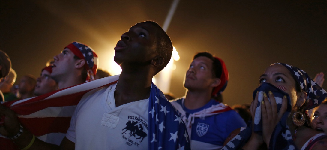 Les noirs américains préfèrent-ils l’équipe de foot des Etats-Unis ou les équipes africaines? Est-ce problématique s’ils préfèrent les équipes africaines? Dans un article intitulé «la vie compliquée des fans afro-américains de la Coupe du monde», la blogueuse Cherae Robinson revient sur cette question de l’identité et du rapport à la nation. PHOTO : Supporters des Etats-Unis lors du match contre le Ghana sur la plage de Copacabana à Rio de Janeiro